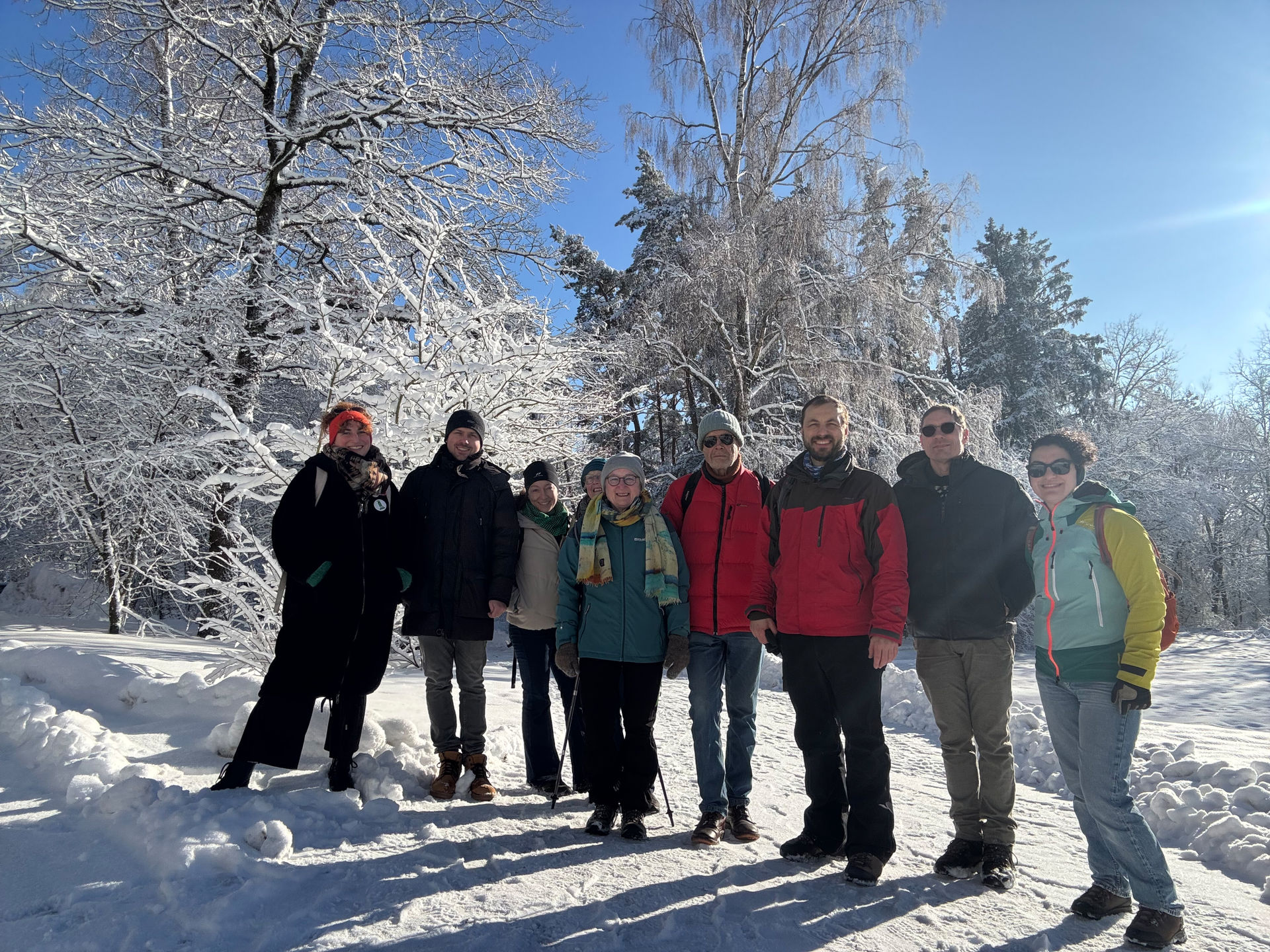 Bei herrlichstem Winterwetter mit Sonnenschein und Minustemperaturen fand die traditionellen gemeinsamen Neujahrswanderung der Ortsvereine Schwaig, Röthenbach und Rückersdorf von Bündnis90/Die Grünen statt. Diesmal wanderte die Gruppe durch dick verschneite Winterlandschaft zur Edelweißhütte. Auch wenn diese zu hatte, bot die Anlage gute Möglichkeiten für ein Picknick im Freien. Frisch gestärkt führte der Weg weiter vorbei am Oberbecken des Pumpspeicherkraftwerks und von dort hinunter zum Happurger Stausee mit Einkehr im Cafe Seeterrassen. Zurück ging es mit der S-Bahn nach Schwaig. Die Wanderung war ein kraftvoller Start in das Jahr 2026, in dem mit der Kommunalwahl wichtige Weichen für unsere Gemeinden gestellt werden. Die drei Grünen Ortsvereine wollen mit ihren gemeinsamen Aktionen Spaß haben, aber auch ihren Zusammenhalt stärken sowie Meinungen und Ideen für grüne Politik und eine bessere interkommunale Zusammenarbeit austauschen. Die Gemeinden stehen vor ähnlichen Herausforderungen: Umstieg auf regenerative Energiequellen, Schutz unserer Naturräume und der Wasserressourcen, Ausbau der Radwege, Sanierung der Schulgebäude und vieles mehr. Voneinander lernen und miteinander planen – so lassen sich Lösungen finden und Synergien nutzen. Die gemeinsame Klimaschutzbeauftragte der drei Gemeinden ist ein gutes Beispiel dafür.
